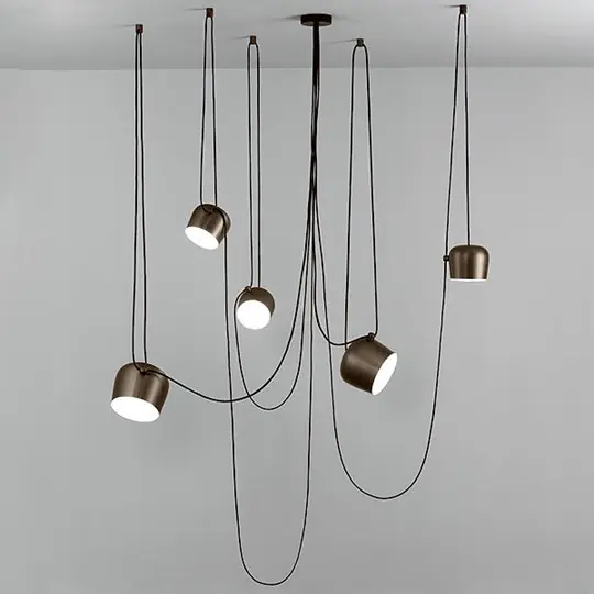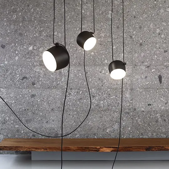 « L’idée générale à la base de ce projet est celle de proposer une lampe qui offre une variété infinie de réglages, pour satisfaire les différentes exigences d’illumination. Nous avons élaboré la proposition d’une nouvelle typologie de lampe qui se place naturellement dans l’espace – comme le ferait une plante – grâce aux longs câbles qui facilitent librement l’orientation et la hauteur de la lumière. Cet objet est la version industrielle des lampes ‘Liane’, présentés à la galerie Kreo à Paris en 2010.” R. & E. Bouroullec