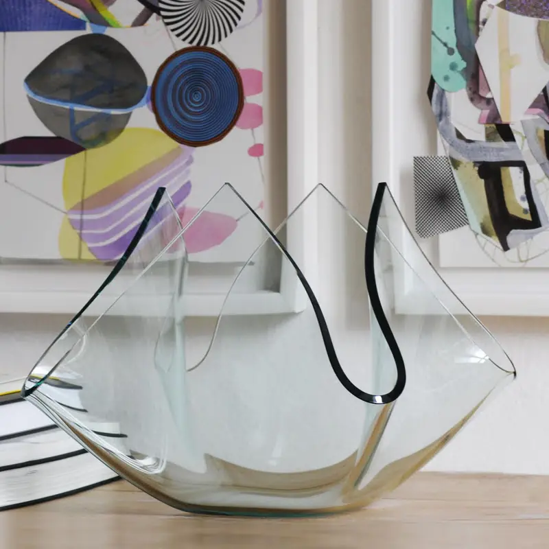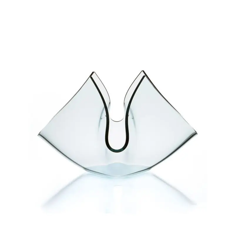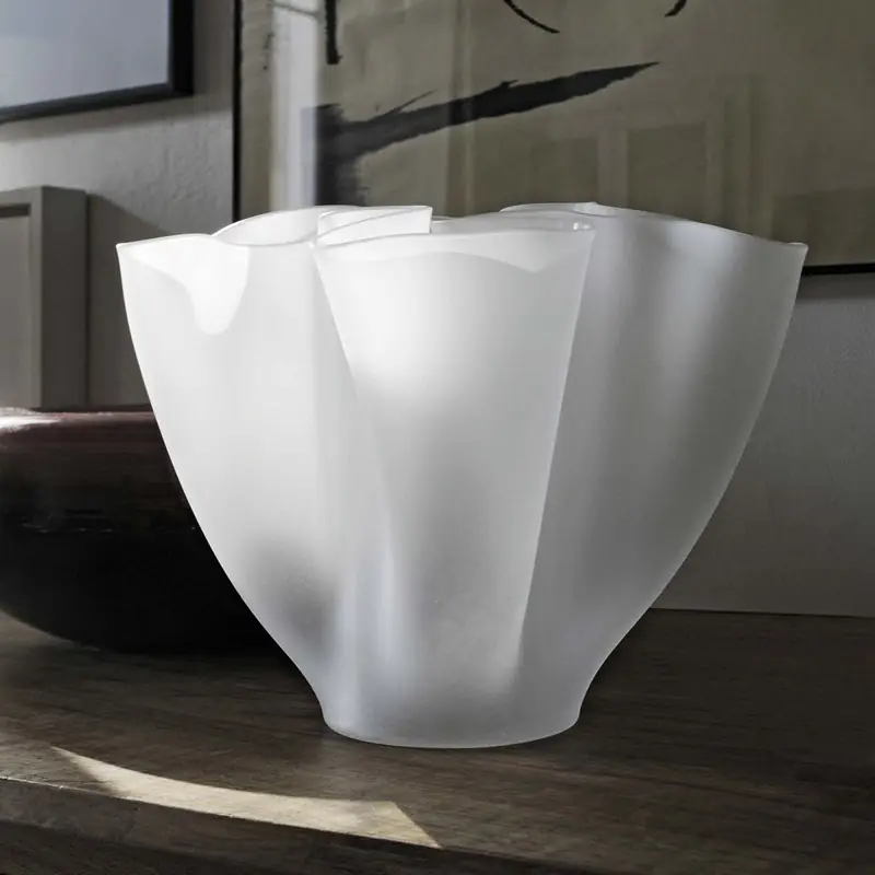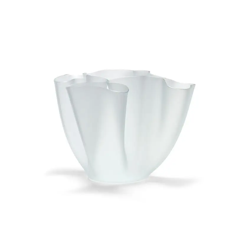 « Vases extraordinaires dessinés par Pietro Chiesa en 1932 et réalisés par pliage à chaud d’une plaque de verre. Cartoccio est disponible en verre naturel ou satiné (blanc et bleu) ou moulé. La fabrication manuelle fait de chaque vase une pièce unique. »