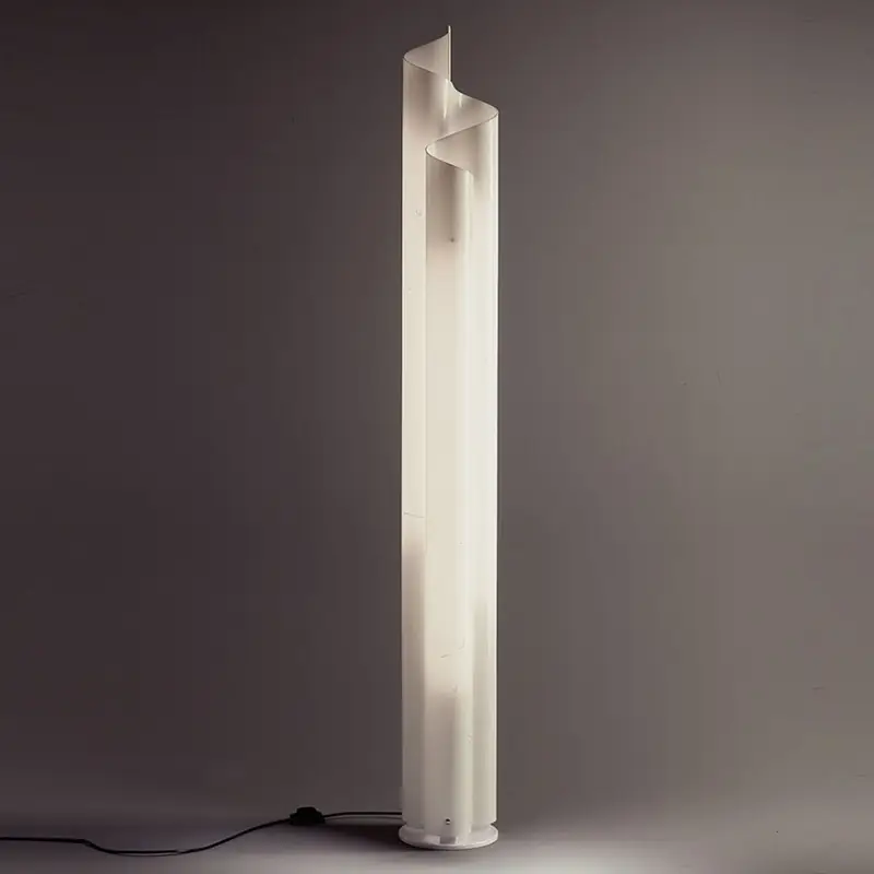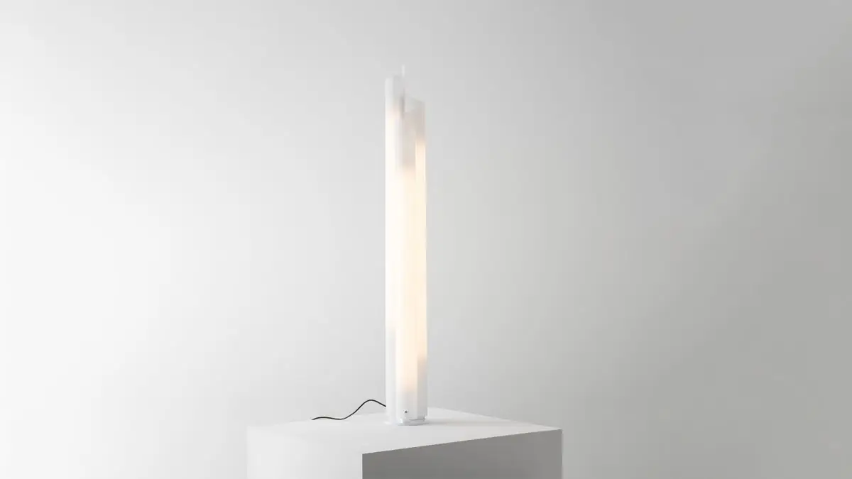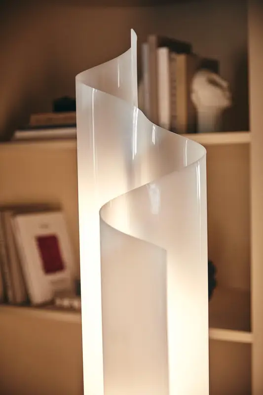 Des courbes sinueuses créées par le façonnage d’une feuille de méthacrylate opalin diffusent doucement la lumière.