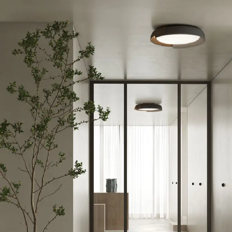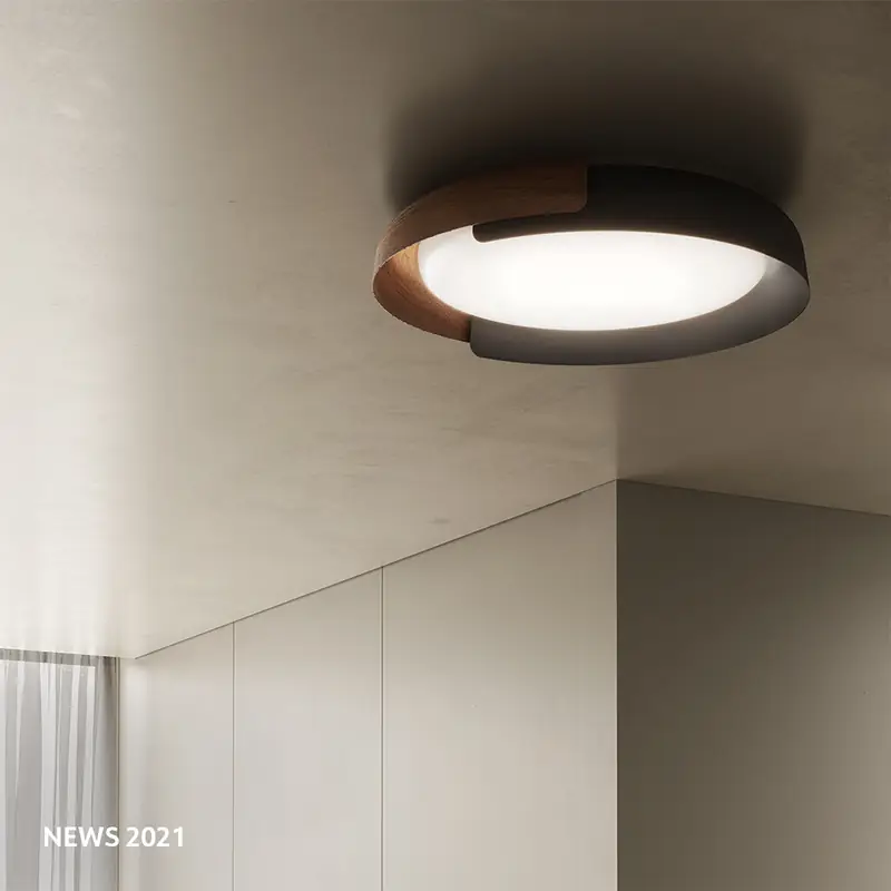 « A la fois décoratif et architectural, Dala combine des lignes fluides avec un design rigoureux. Les deux coques métalliques entourent le grand diffuseur, se chevauchant comme les pétales d’une fleur. Avec un contraste de couleurs raffinés, elles rappellent le mouvement naturel d’une corolle qui embrasse la lumière. «