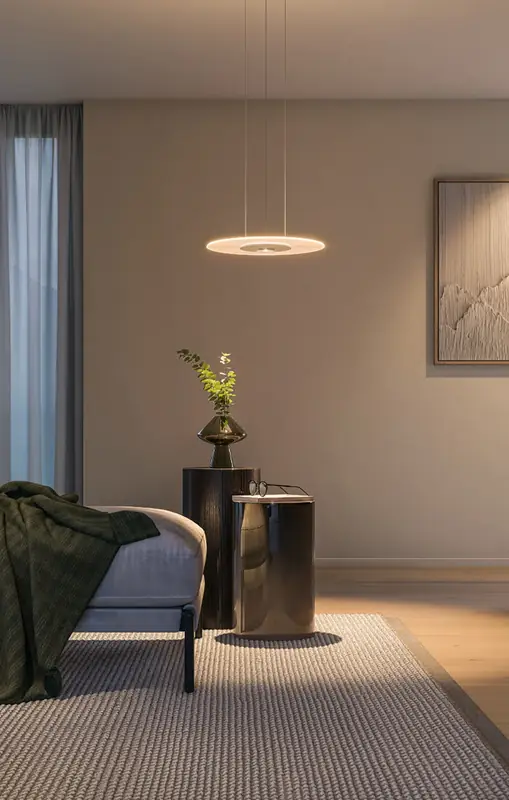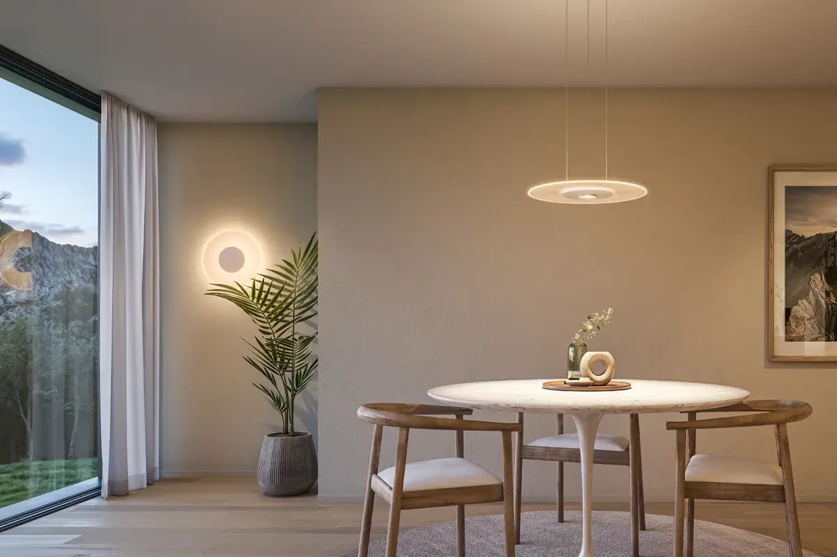 Une lumière qui apparaît transparente, presque invisible, mais qui, lorsqu’elle est allumée – semblable au soleil – devient un disque lumineux.