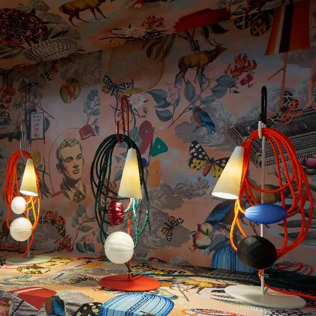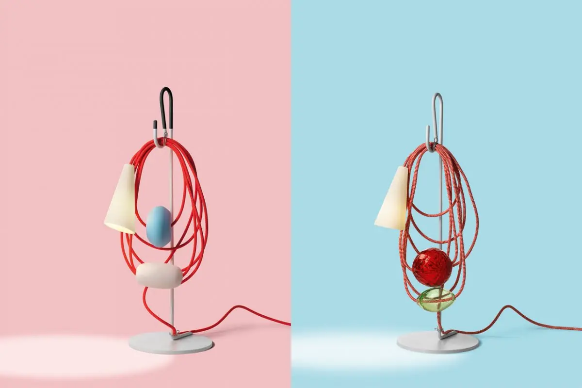 « Filo naît du désir de mettre en évidence les différentes parties qui composent une lampe – source lumineuse, décoration et cordon électrique – en articulant ses caractéristiques structurelles et esthétiques, dans un processus de simplification grammaticale et syntaxique. Son caractère essentiel est le fruit du choix d’utiliser la décoration pour revêtir un aspect fondateur, en incorporant des éléments qui ne sont traditionnellement pas pris en compte. Ici, le cordon ou fil électrique dialogue avec les éléments en verre et le diffuseur lumineux, dans un jeu rythmé où les rôles s’échangent. L’énergie électrique passe dans le fil, permettant à la lampe de remplir sa fonction d’éclairage. Dans ce même fil se trouvent également enfilées des sphères et des bulbes en verre qui le transforment en une sorte de collier, avec un corps en porcelaine en forme de cône qui projette la lumière sur le fil et sur les sphères en verre, soigneusement positionnées en guise de pendentif. »