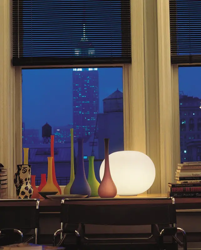 « Le concept simple de la famille de luminaires Glo-ball est d’obtenir la diffusion lumineuse maximale grâce à l’utilisation d’un verre opalin blanc, acidifié et soufflé à la bouche. La forme : un globe aplatit, comme une lune, comme un disque plat lorsqu’il est éclairé. »