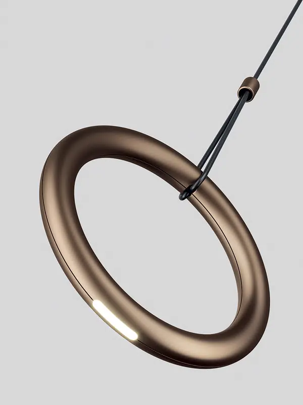 Le design a également été inspiré par les bagues, en particulier les alliances, comme pendentifs sur les colliers. Ce motif se traduit par la position de l’anneau sur le double câble, le renforçant comme un objet simple mais précieux, faisant de la perfection de sa forme la valeur.