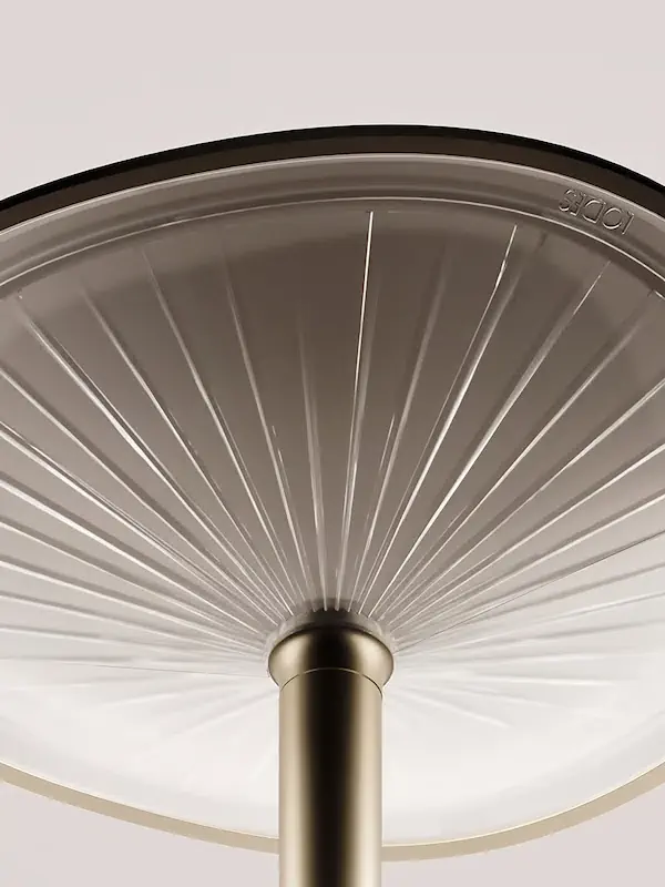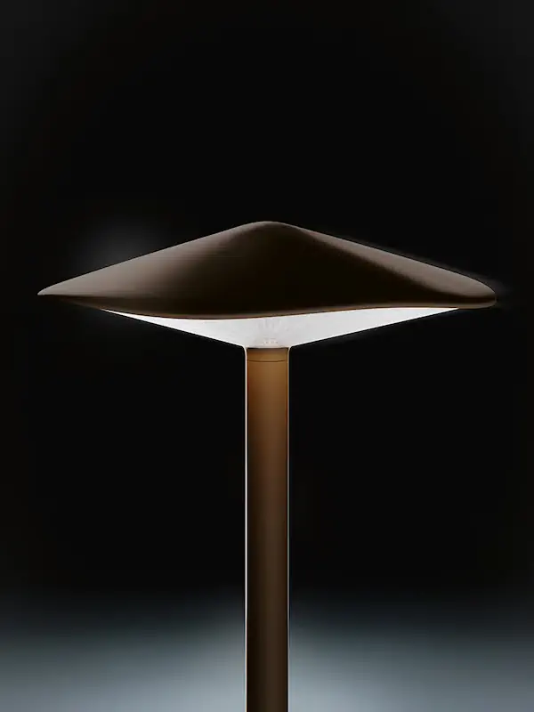 La silhouette élégante évoque la forme d’un champignon – d’où son nom, Kinno, qui signifie champignon en japonais – et joue avec la perception visuelle rappelant l’harmonie imparfaite du monde naturel. Le dôme, parfaitement circulaire vu d’en haut, révèle une douce irrégularité sous d’autres angles, mettant en valeur son design organique. De même, les lames radiales, intentionnellement insérées sous le dôme, créent un effet inattendu, encore plus naturel, repris par la tige, proposée en version droite ou courbée, pour donner encore plus de mouvement et de spontanéité à la composition lumineuse.