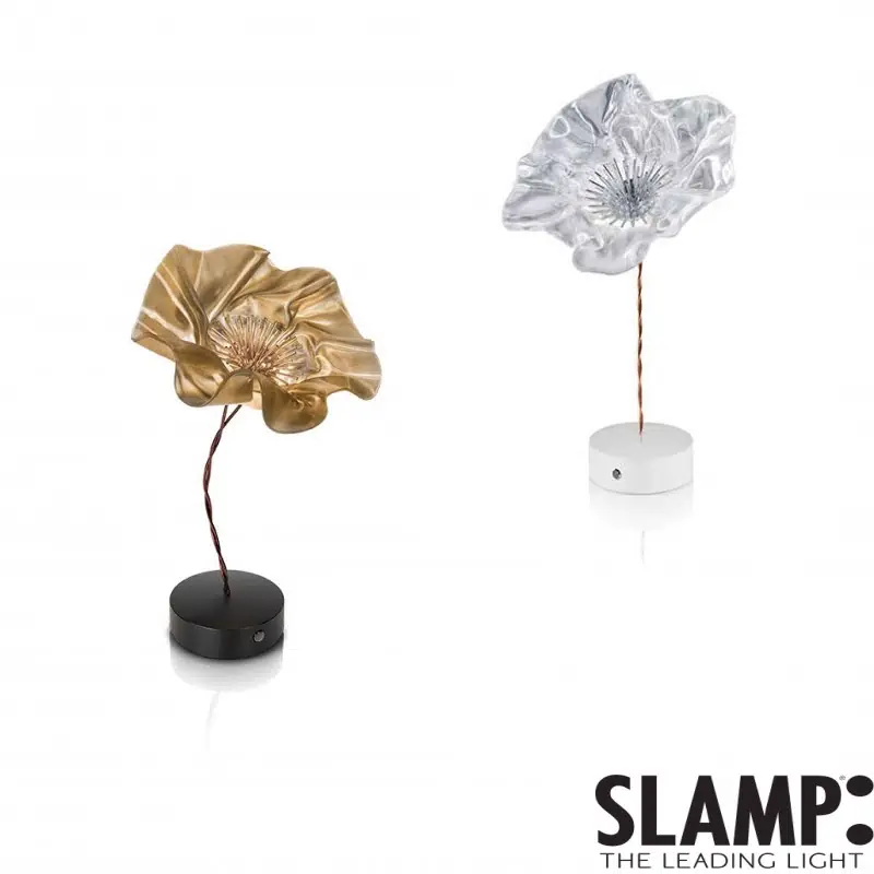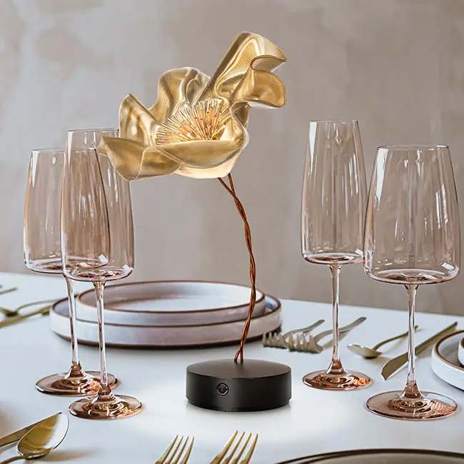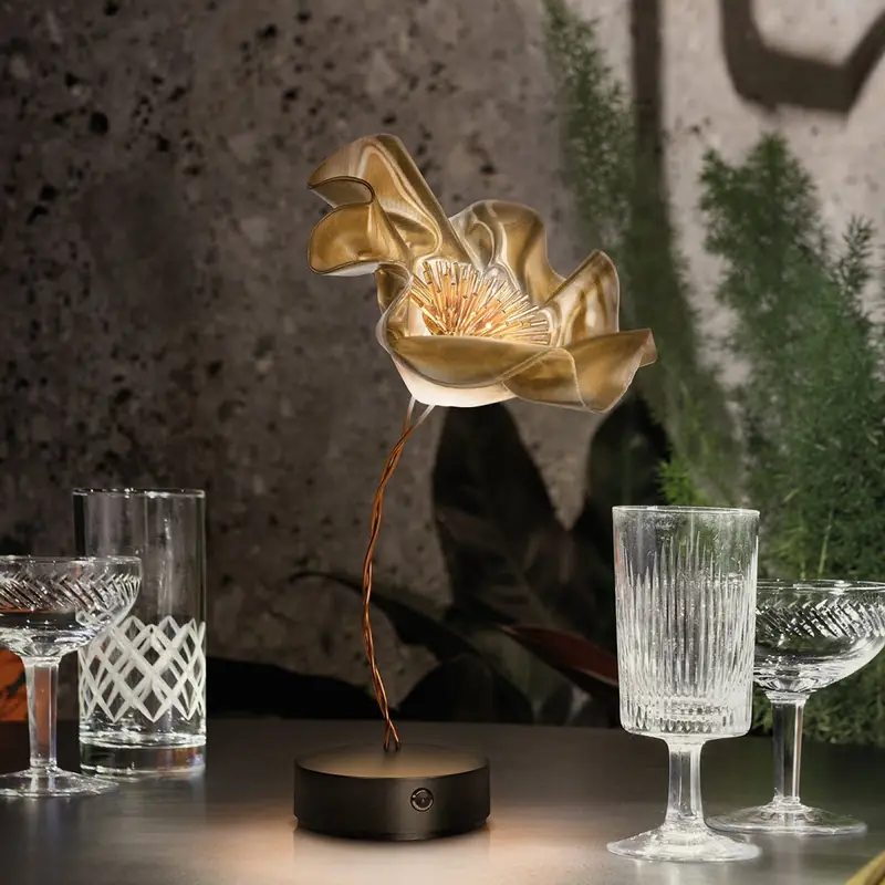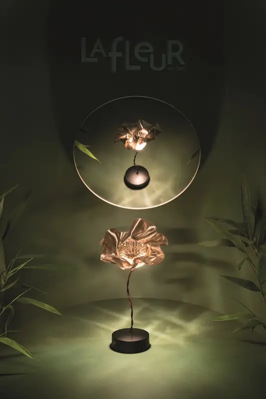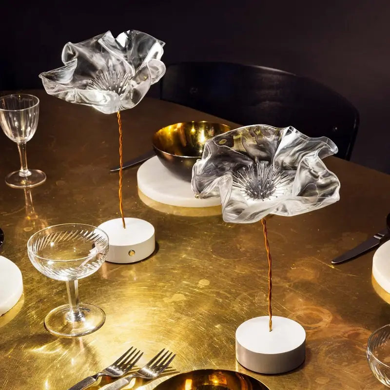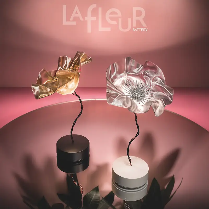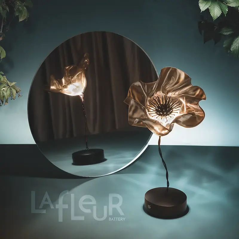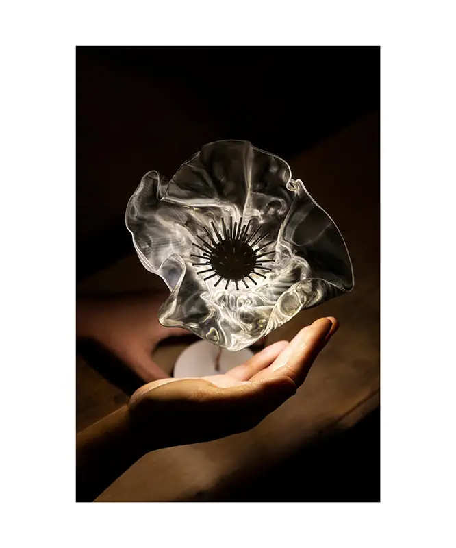 Délicate lampe à batterie rechargeable, modelée littéralement à la main pour donner vie à la corolle d’une fleur, disponible dans la couleur prisma et velvet.