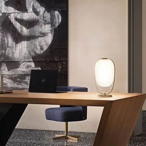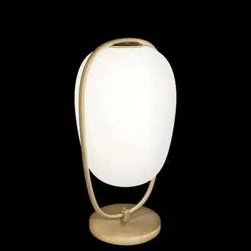 Son diffuseur en verre soufflé opale doux et velouté est suspendu en équilibre à l’intérieur d’une structure métallique.