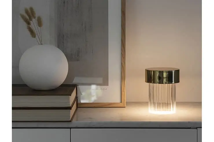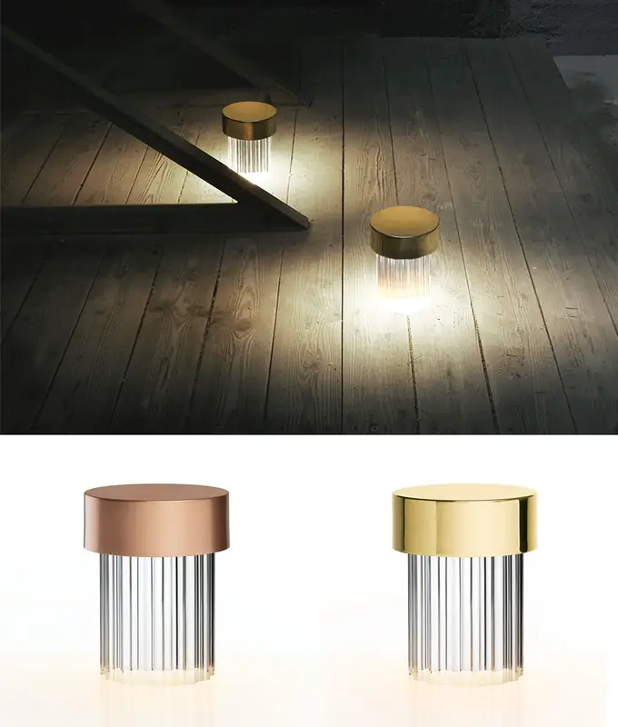 Lampe de table rechargeable qui diffuse la lumière à travers une base en cristal solide transparent crénelé dont la forme fait référence à la typologie architecturale de la colonne antique.