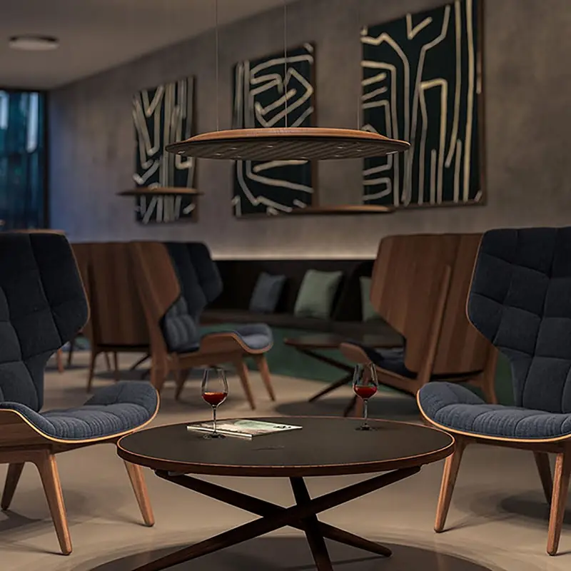 La lumière rencontre l’acoustique: émotionnelle, confortable et intelligente. Une composition intemporelle de style, d’acoustique et de lumière.
