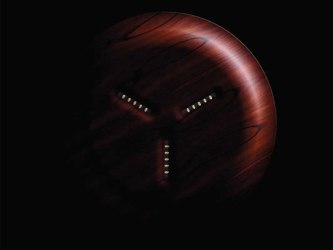 Le dessus de la lampe est en bois moulé de haute qualité, un feutre gaufré acoustiquement efficace forme la contrepartie inférieure. Une lumière sobre émerge de la forme fluide et douce, non éblouissante, sublimée par la chaleur du bois et la fonctionnalité intelligente.
