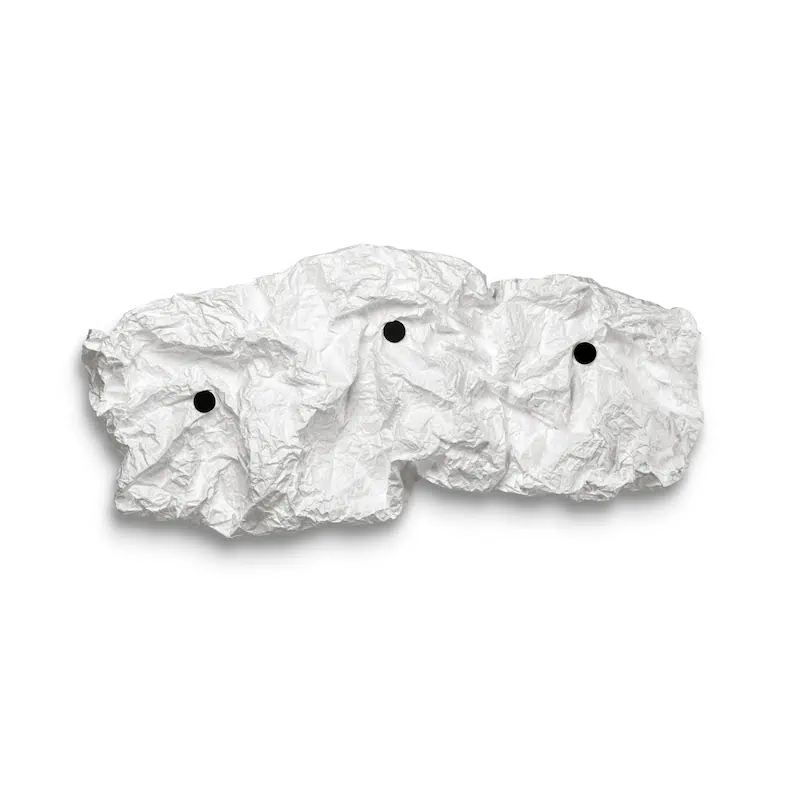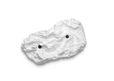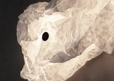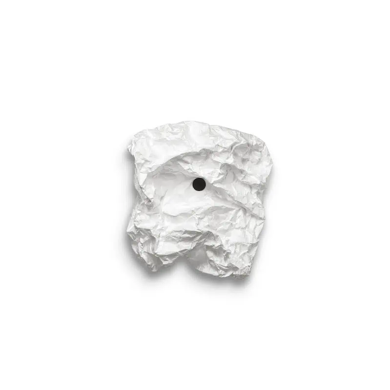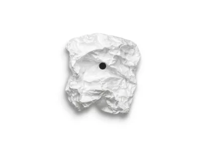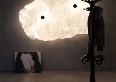 Applique murale émettant une lumière diffuse. Sources LED montées sur une plaque arrière ronde en fer de montage mural peinte en blanc mat. Corps de lampe en fibre ultralégère et légère et résistante à la déchirure. Boîtier fixé magnétiquement au cadre métallique à l’aide de grands boutons magnétiques alignés avec quatre points magnétiques. Conçu pour être froissé manuellement pour créer sa forme finale.