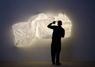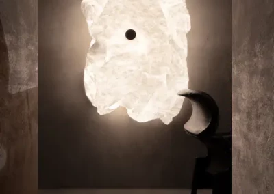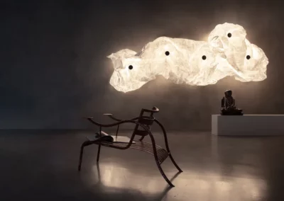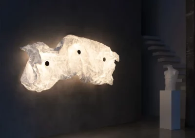 Maap d’Erwan Bouroullec réunit trois thèmes récurrents dans son travail : la géométrie, les structures naturelles et la légèreté. Conçue comme une surface d’éclairage expansive, sa membrane ultra-légère en forme de papier doit être froissée pendant l’installation, confrontant une géométrie précise à l’imprévisibilité et formant un paysage lumineux qui peut être remodelé à l’infini. Ressemblant à un nuage de lumière organique, Maap diffuse une lueur douce et immersive sur une vaste zone avec un design à la fois radicalement simple et intrinsèquement complexe.