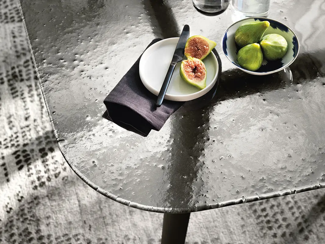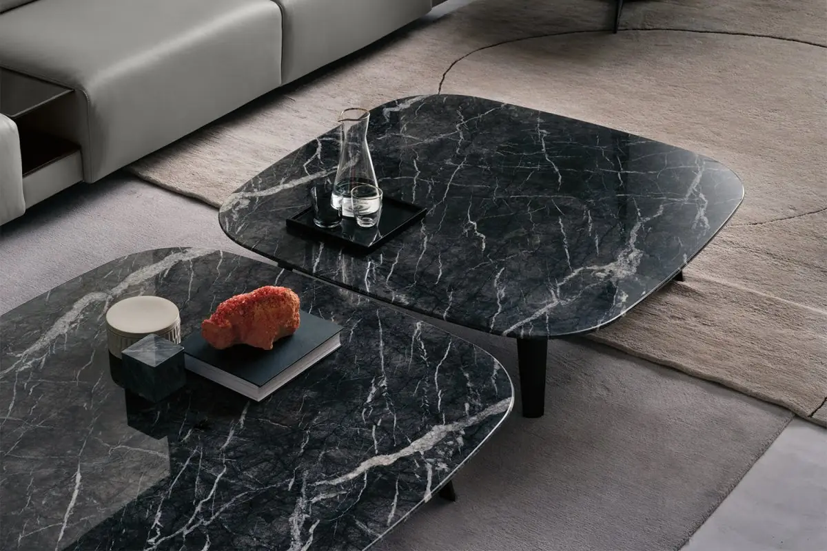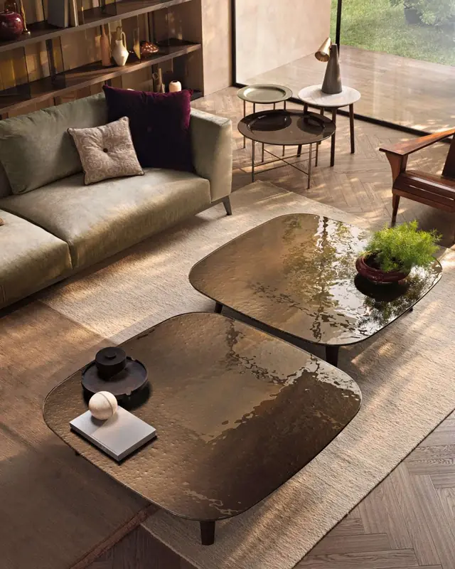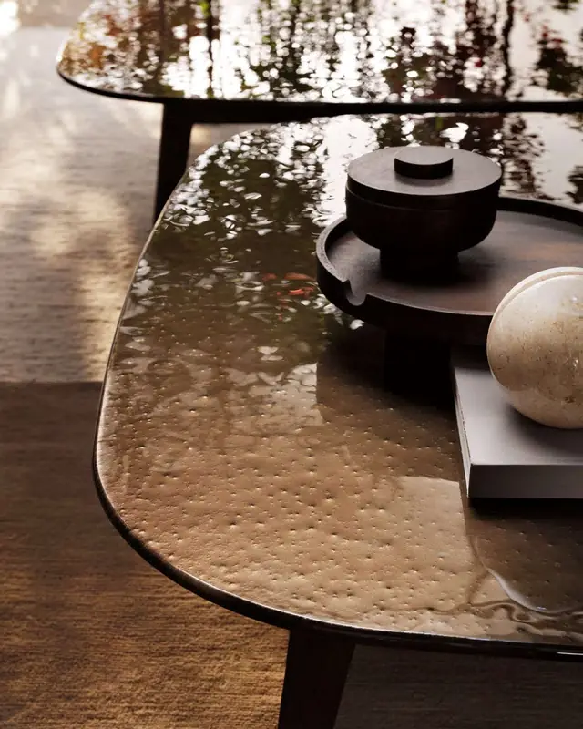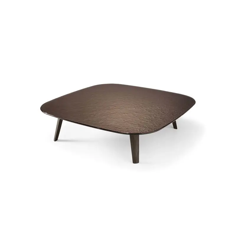 Table basse avec plateau en verre en fusion de 12 mm trempé, verni dessous avec des teintes semi-transparentes ou métallisées. Plateau disponible aussi en marbre, épaisseur 20mm. Structure en bois massif disponible dans les finitions Tabac ou thermotraité noir.
