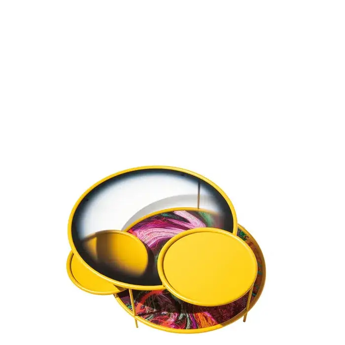 Dans la culture japonaise, les Sangaku sont des problèmes géométriques gravés sur des tablettes de bois, qui illustrent dans la plupart des cas des problèmes impliquant des cercles et des ellipses inscrits les uns dans les autres. De là est née l’idée d’inscrire quatre cercles différents, deux de rayon 40 cm et deux de rayon 20 cm, à l’intérieur d’un cercle imaginaire de 50 cm, créant ainsi un nouvel élément régi par des relations géométriques invisibles mais néanmoins perceptibles. Les points d’intersection entre les différents éléments deviennent les pieds qui soutiennent les quatre plateaux différents, qui remplissent et différencient habilement l’espace, créant un mélange parfait de pleins et de vides.