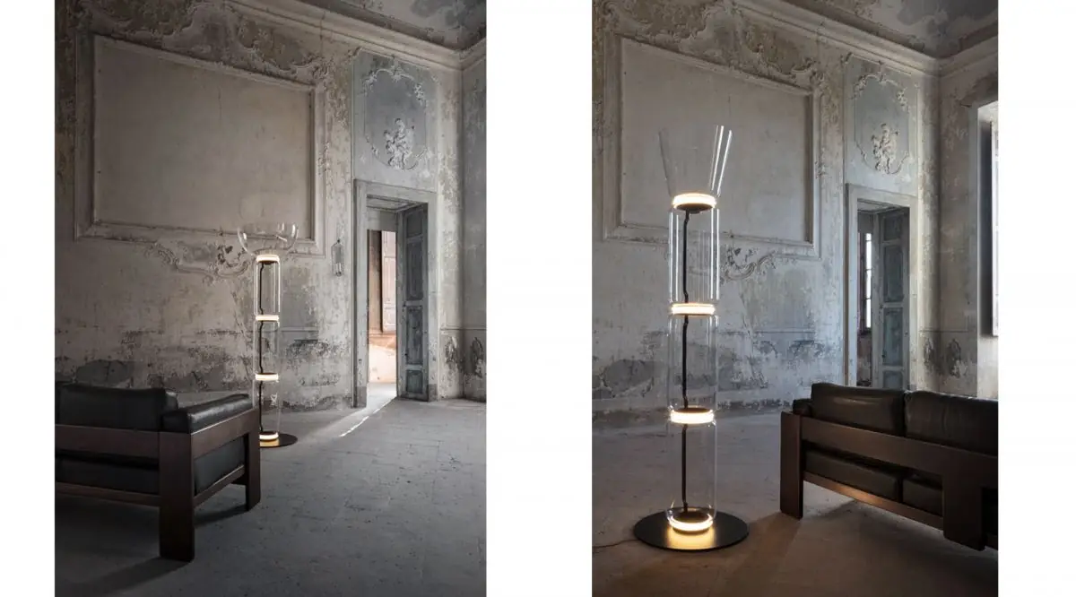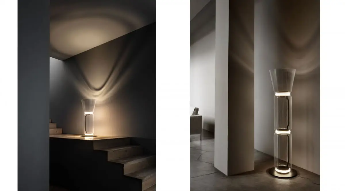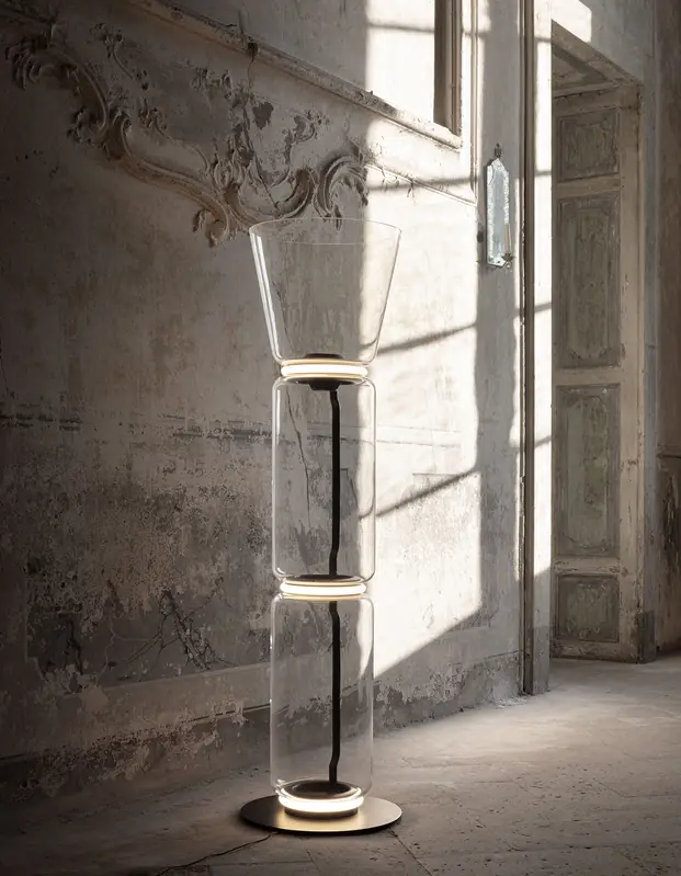 « Noctambule: l’oiseau de nuit ou le fêtard. La plupart du temps invisible pendant la journée, mais se terminant par une activité glamour la nuit. L’analogie est appropriée. La nouvelle collection de lampes est composée de modules en verre soufflé, transparents et donc quasi inexistants le jour. Mais, lorsque vous les allumez dans le noir, ils se transforment en magnifiques lampes lumineuses. Les modules de verre cylindriques définissent la grammaire de base de la collection. L’unique module est une lanterne. Plusieurs modules empilés les uns sur les autres créent une colonne lumineuse ou un lustre suspendu dans un puits d’escalier. Des éléments supplémentaires, tels qu’un dôme en verre ou une tête en forme de cône, permettent une performance accrue, comme un éclairage au sol et une suspension. La technologie LED soigneusement calibrée qui alimente les lampes est intégrée discrètement dans les jonctions entre les modules de verre. Presque absent, mais prêt à être activé à tout moment (de nuit). » – Konstantin Grcic