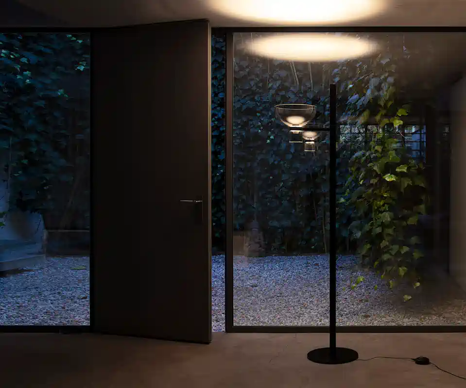 Nocturne dispose également d’un anneau lumineux délicat, la caractéristique esthétique de la collection, qui marque le jonction entre la lampe et son bras de support, donnant une lueur éthérée au corps en verre.