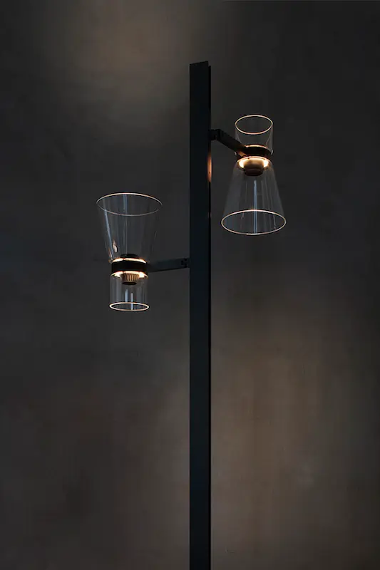 L’identité de Nocturne se définit par le contraste visuel entre le raffinement éthéré du verre et l’apparence résolument industrielle du composant technique monté sur rail, donnant naissance à un design sophistiqué au caractère distinctif.