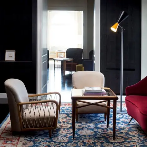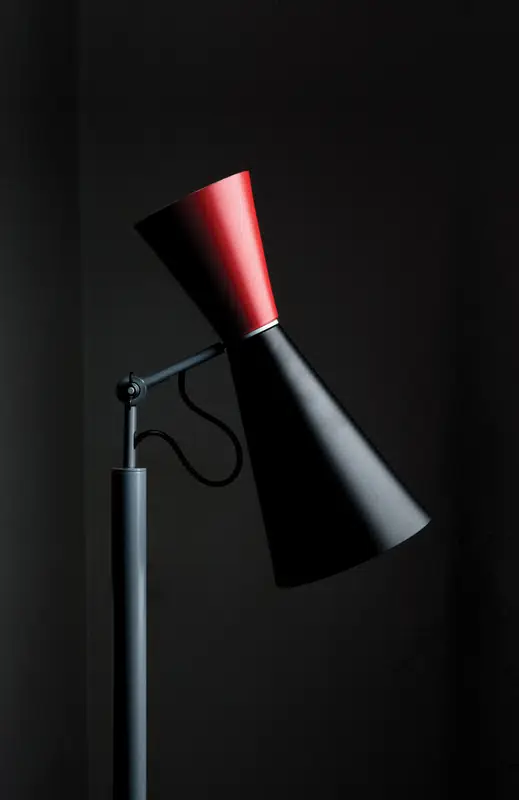 Lampadaire orientable à double émission, en aluminium laqué avec diffuseurs noir mat et jaune, noir mat et rouge, jaune et vert ou blanc et gris. L’intérieur des diffuseurs en blanc. Tige gris mat.