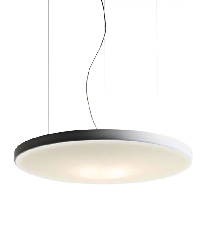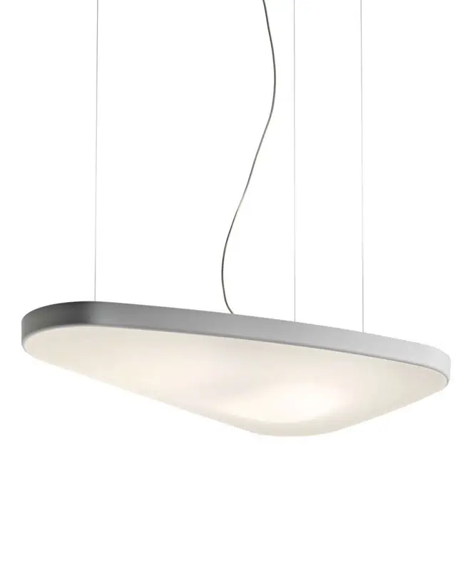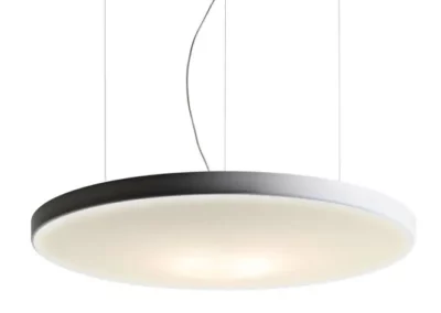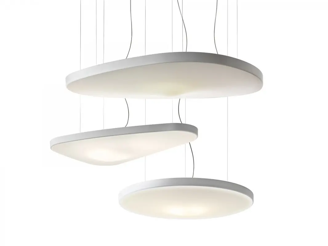 « Une suspension de forme organique dissimulant la magie du silence: le corps de la lampe, recouvert d’un tissu blanc, est constitué d’un panneau insonorisant qui améliore le confort acoustique dans l’espace. Disponible en trois dimensions. »