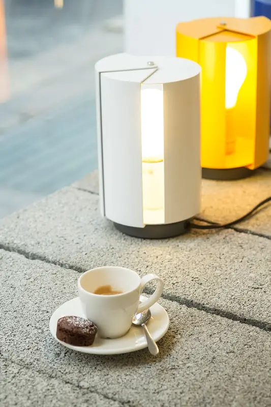 Lampe de table, composée d’un corps cylindrique ouvert sur deux côtés, où tournent deux écrans, qui permettent l’ouverture ou la fermeture du faisceau de lumière, afin de gérer la lumière de façon directe ou indirecte. Base en acier peint gris opaque, corps en tôle incurvée peint en blanc, jaune ou bleu mat. Interrupteur sur le câble.