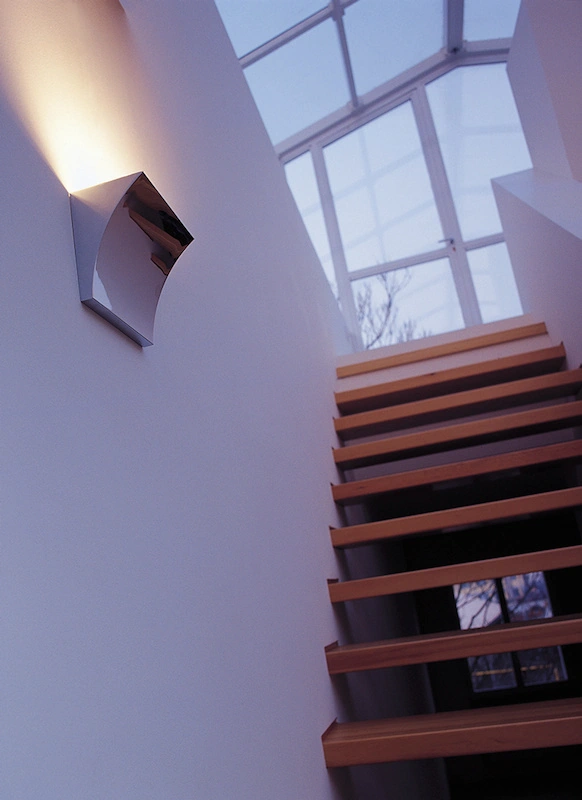 « Pochette est une applique murale qui se distingue par la forte présence du métal poli. La forme sinueuse et brillante des surfaces altère la perception visuelle de l’objet, attribuant à la source lumineuse le charme de la surprise.” Rodolfo Dordoni