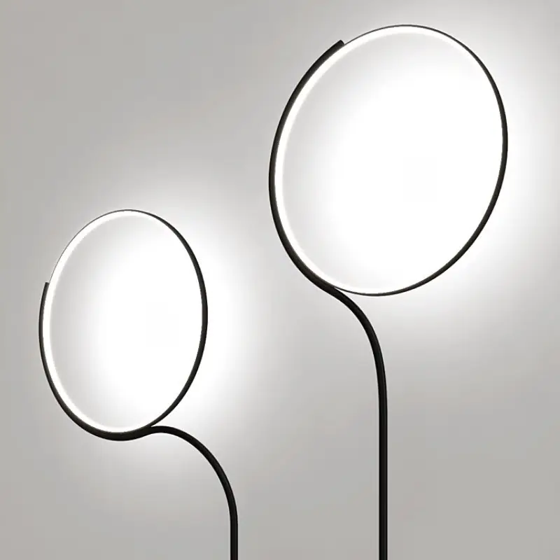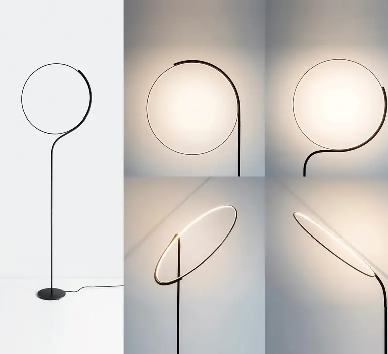 « Sur Poise, la curiosité et l’interaction humaine avec la source lumineuse sont encouragées par la section flexible entre la tige et le cercle, qui permet de déplacer ce dernier dans n’importe quelle position. Un dynamisme qui défie la force de gravité pour créer des configurations changeantes ».