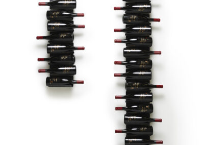 Dans Ptolomeo Vino, le contenant se tient à nouveau à l’écart, laissant la vedette à son contenu. Les bouteilles de vin sont les principaux protagonistes, semblant flotter dans l’air, leurs étiquettes devenant un élément fortement décoratif.