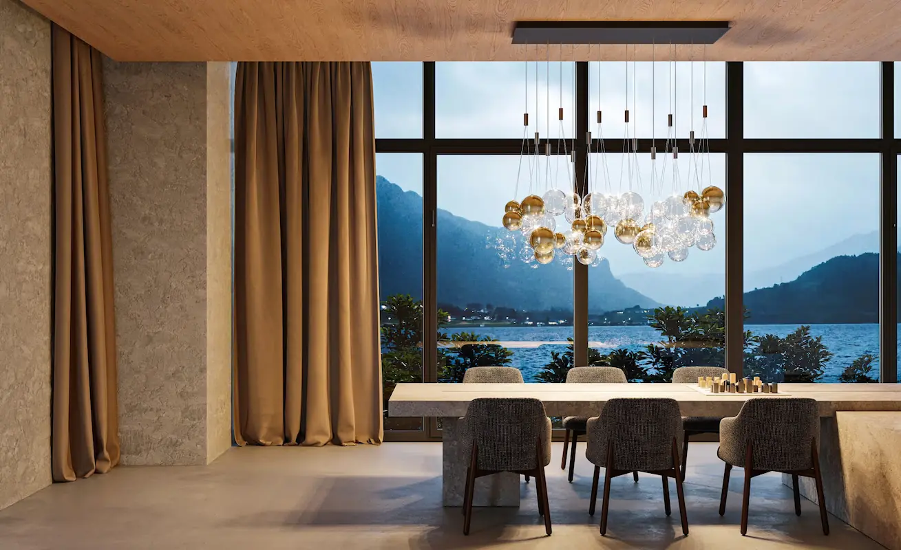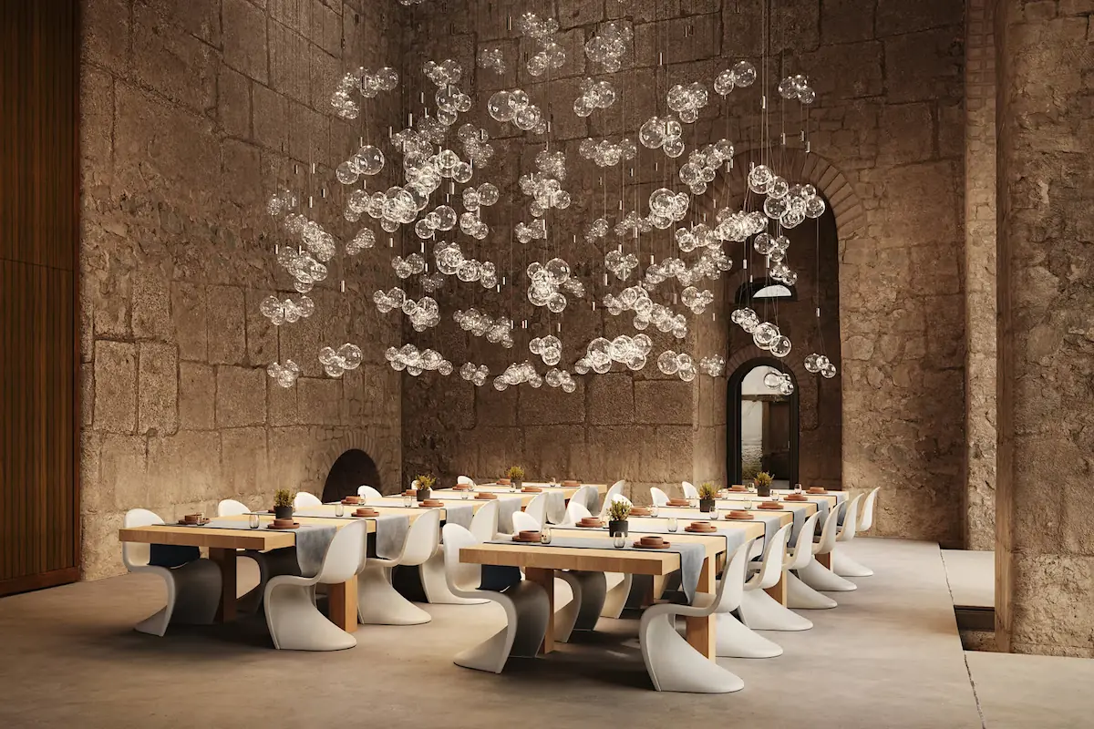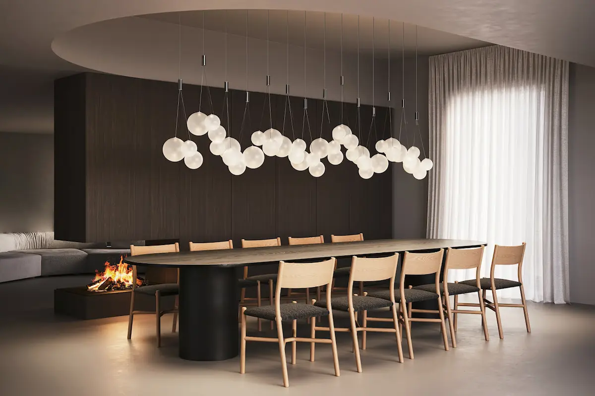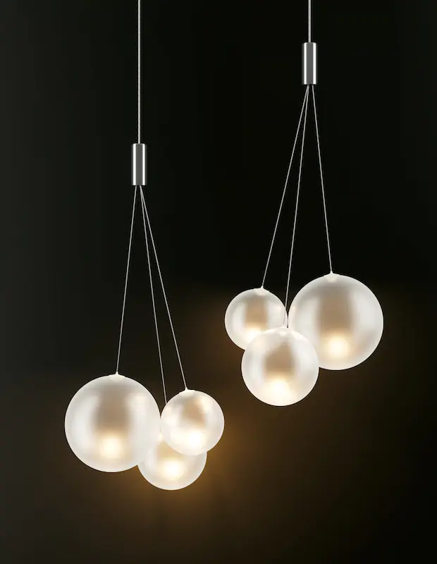 Random évoque des images de bulles mousseuses dansant de manière ludique dans le vent. Random émule la nature éphémère des bulles avec du verre soufflé parfaitement lisse.