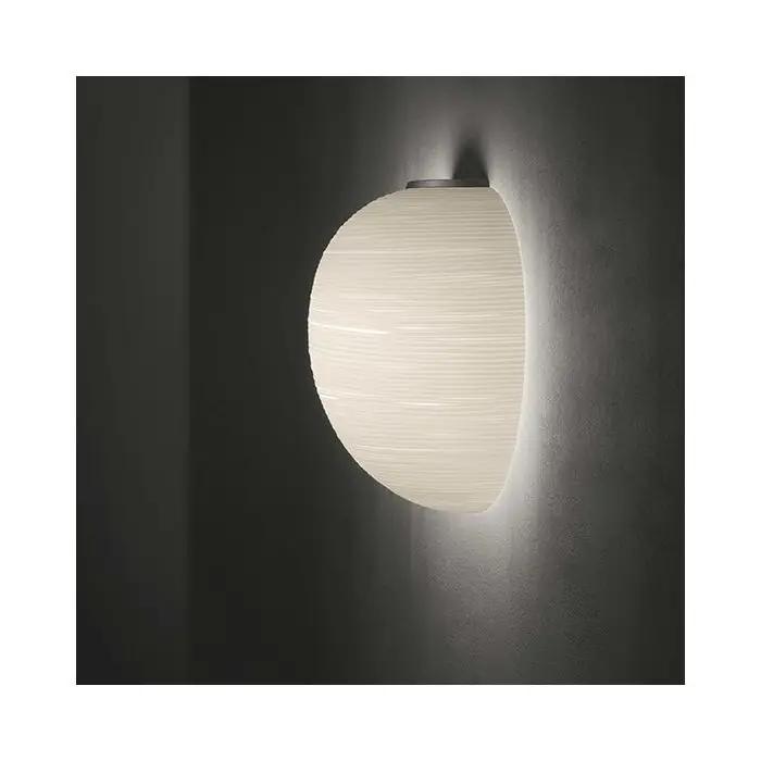 « Rituals traduit la magie lumineuse des lanternes orientales en papier de riz dans la texture précieuse du verre soufflé. L’aspect particulier du verre, dont la surface est sillonnée par des lignes irrégulières, produit des motifs doux et séduisants qui créent une impression unique de clair-obscur et une lumière douce et tamisée. Semblable au piédestal d’une œuvre d’art, la forme en L renversé de la monture des Rituals applique, permet différentes solutions d’installation, vers le haut ou vers le bas. »