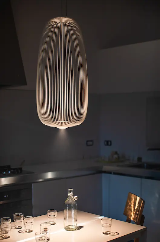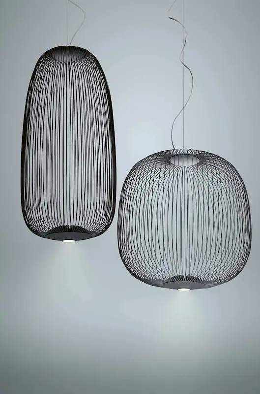 « La suspension Spokes prend son inspiration des anciennes lampes orientales à volières domestiques. La réalisation naît de l’observation des rayons d’une roue de vélo, d’où le nom du projet: Spokes, signifie « rayons » en anglais. Résultat : une lampe aux formes rondes et au volume léger qui contient la lumière, tout en la laissant filtrer dans l’espace. La légèreté qui caractérise le projet s’associe à la solidité de la forme, réalisée en fil de métal, et à la fonctionnalité de la source lumineuse à LED. »