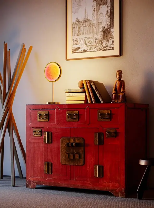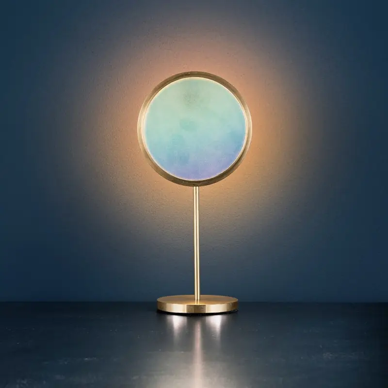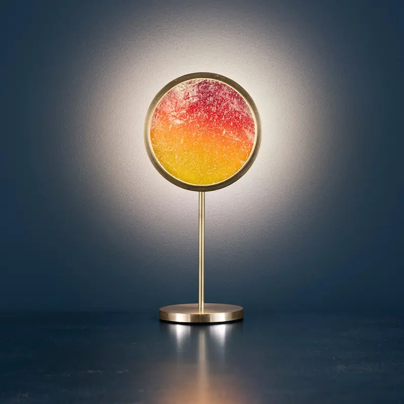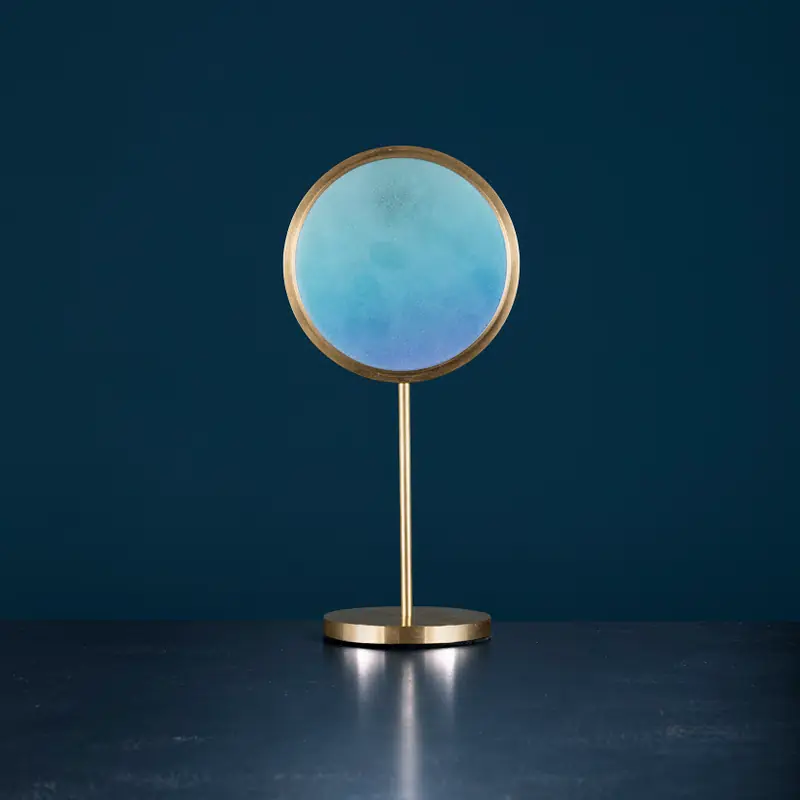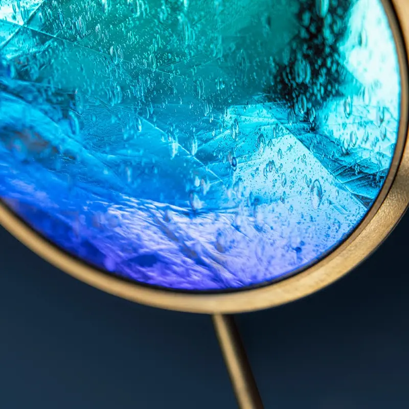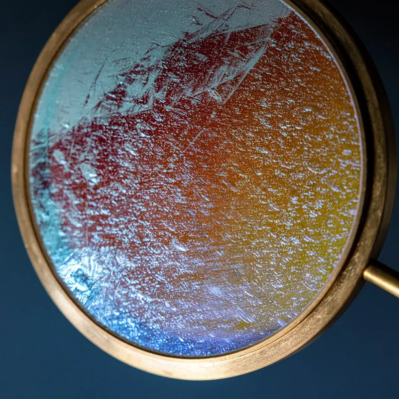 Sa structure en laiton renferme un verre irisé articulé en plusieurs étapes, dont l’effet particulier obtenu rend chaque pièce unique.