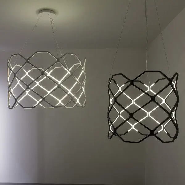 Titia est un tourbillon de lumière suspendu. «Je pensais à une lampe qui réunirait l’esprit des guirlandes de Noël et des manèges en bois», résume Arihiro Miyake. «C’est une vieille idée que je peux enfin concrétiser grâce au développement de la technologie LED. Un groupe de points de lumière est enfermé dans une forme aussi claire que possible. » L’objectif de Titia est d’éclairer une table de manière diffuse et homogène. Titia est une silhouette de fil délicate et est disponible en noir ou en blanc.